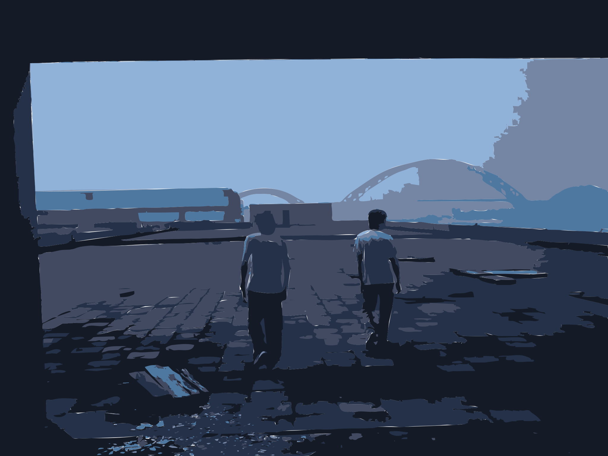 This features two people walking down a street, possibly in an urban setting. They are both wearing white shirts and appear to be engaged in conversation with each other as they walk. One person is located on the left side of the scene while the other is positioned more towards the center. The street appears to have some rubble or debris scattered around, adding a sense of realism to the image.