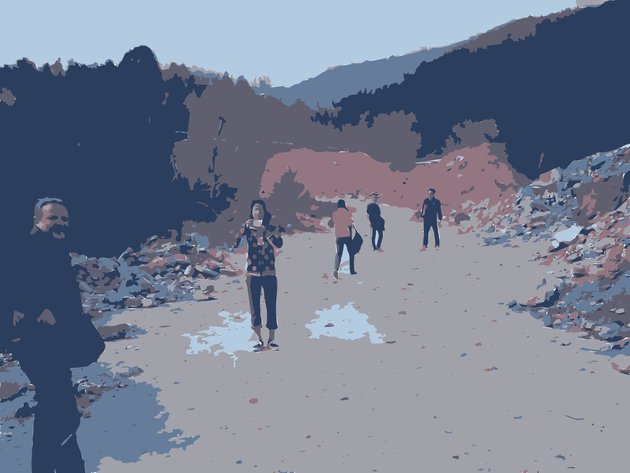 This features a group of people walking down a dirt road, with some of them carrying backpacks. There are five individuals in total, spread out along the pathway. They appear to be enjoying their walk together and possibly exploring the area. The scene is captured in a blue-toned photo that gives it an artistic touch.