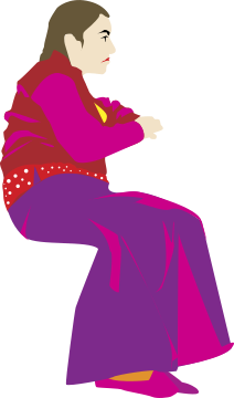 This features a woman wearing a pink dress, sitting down with her legs crossed. She appears to be looking at something in the distance or possibly posing for a picture. Her outfit is colorful and adds a vibrant touch to the scene. The woman's posture suggests that she might be relaxed or contemplating something while enjoying her time indoors.