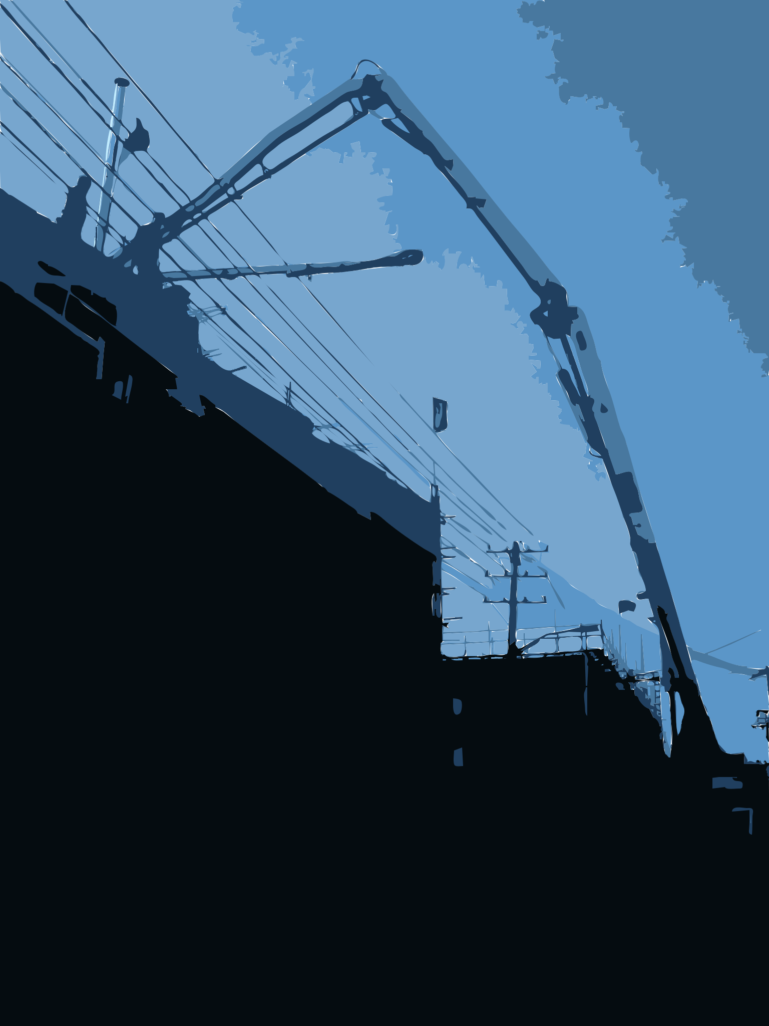 This is a black and white photo of a crane in the sky. It appears to be an old picture, possibly taken during the 2010 travels of its creator. The crane is situated above a building with power lines running through it. There are several poles visible in the scene, some of which are holding up the crane and others that are part of the electrical infrastructure.