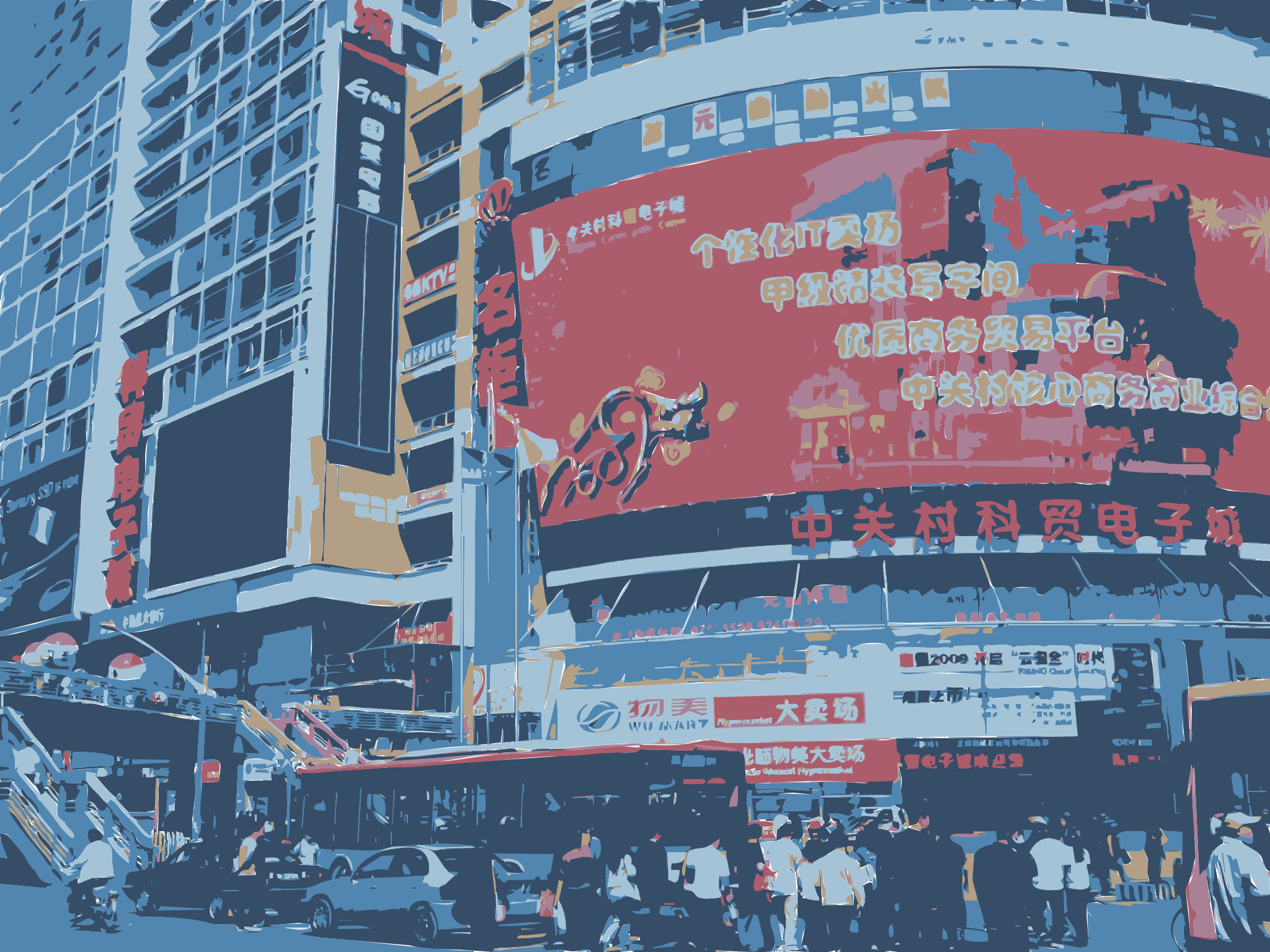 This is a blue and red colorized photo of a busy city street with people walking around. There are several cars parked along the sidewalk, and some are driving down the road. A large billboard can be seen in the background, adding to the bustling atmosphere of the scene. Many pedestrians are visible throughout the image, going about their daily activities. The overall impression is that of a lively urban environment with people engaging in various tasks and enjoying the city's offerings.