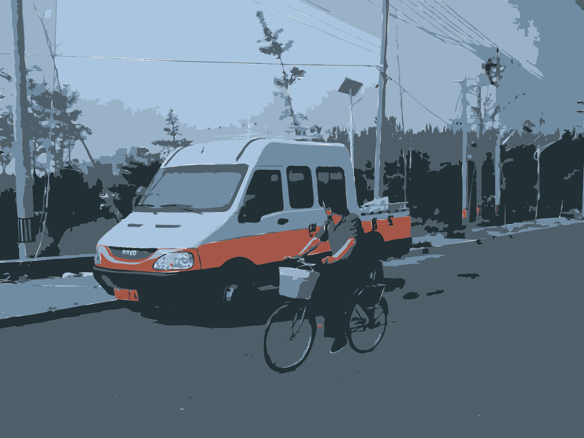 Tags: photo, autotrace images, rejon, jonphillips, donation, convert, streamline, travel, 2010, china, beijing, caochangdi, aiweiwei, black and white, color photo, bus, bicycle, man, street, parked car