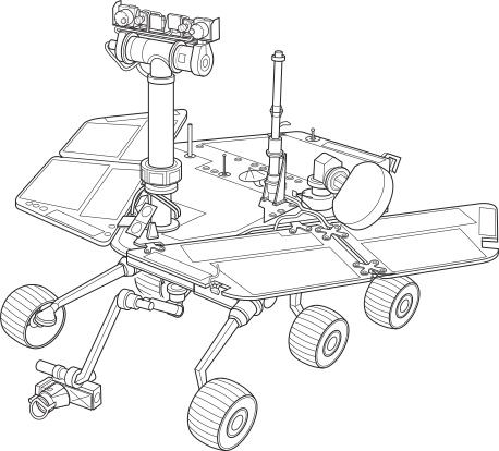 Tags: black & white, blueprint, contour, exploration, mars, nasa, outline, rover, space, technical drawing, vehicle, robot, car, truck