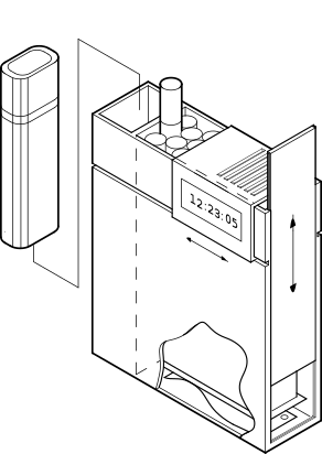 This displays a detailed drawing of an electronic cigarette box. Inside the box, there are eight cigarettes neatly arranged in rows. The design is simple and functional, with the cigarettes stored in a compartment that allows for easy access. The drawing provides a clear representation of the internal structure of the cigarette box, showcasing its components and layout. This type of design could be used to create an innovative and efficient way to store and transport electronic cigarettes.