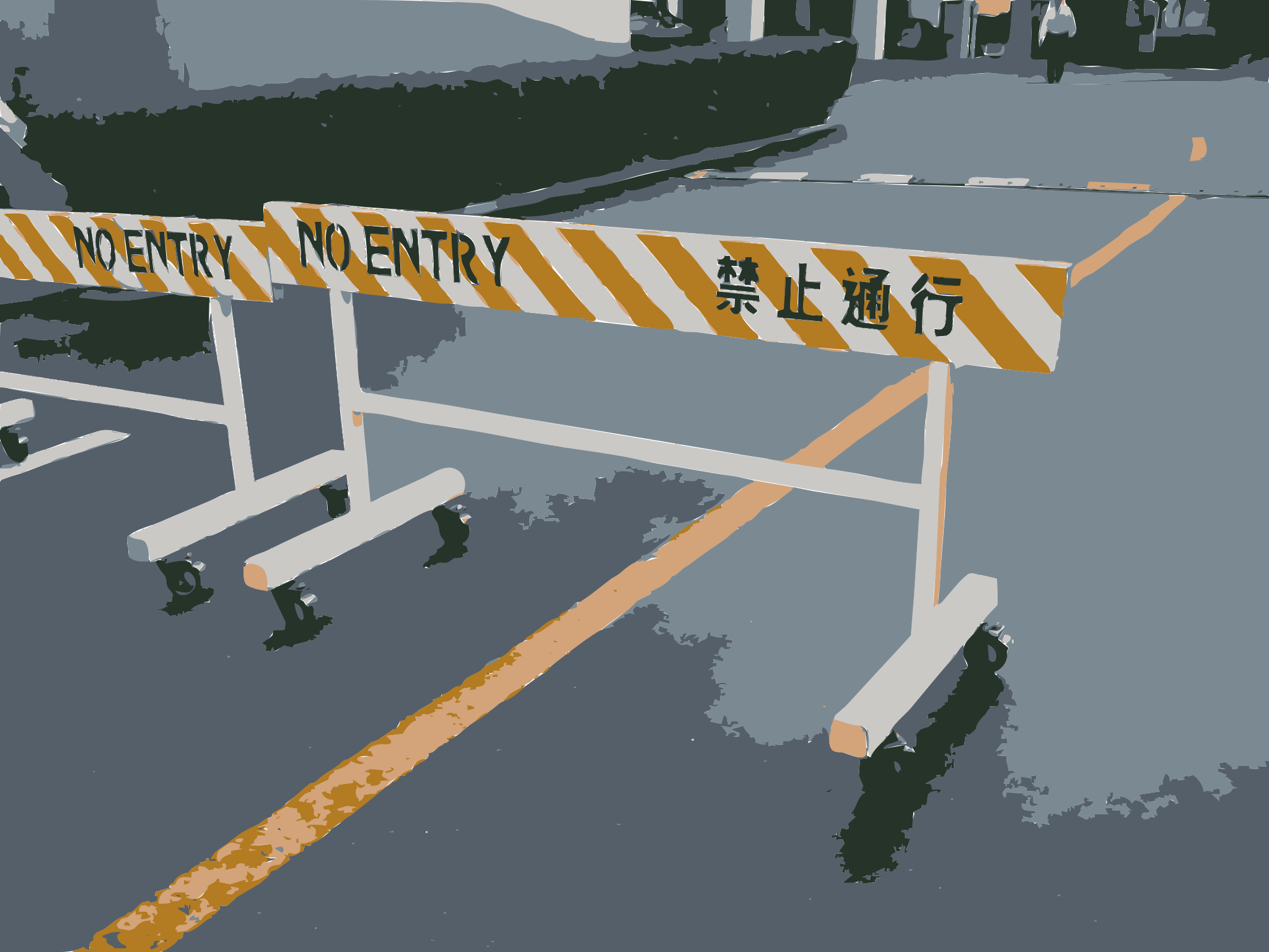 This features a street scene with a yellow and black barricade set up to block off an area. The barricade is made of two poles, one on each side, and has a sign attached to it in both English and Chinese. The sign reads "No Entry" and is placed above the barricade to ensure that no vehicles or pedestrians can enter the restricted area.