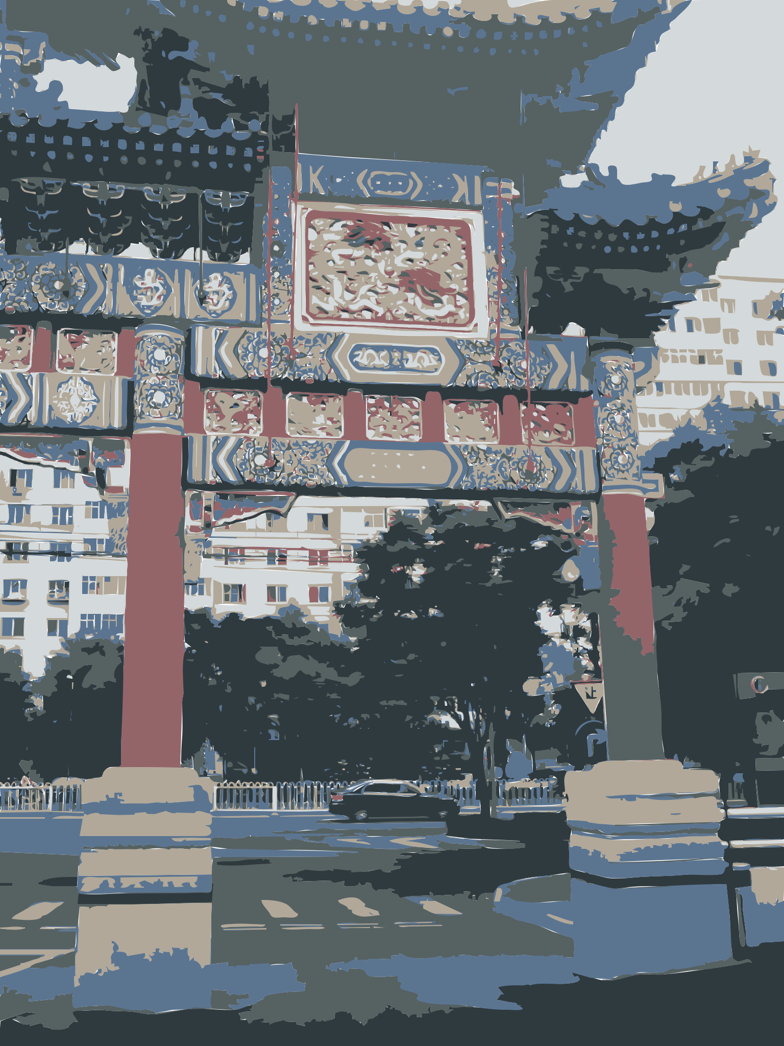 This features a large red and white oriental style structure, possibly a pagoda or an ornate bridge. This structure is situated in the middle of a city street, surrounded by buildings on all sides. There are several people walking around the area, with one person closer to the left side of the scene and two others nearer to the right side. A car can be seen parked further back on the right side of the image. The overall atmosphere suggests an urban setting with a touch of cultural influence from the oriental design elements present in the structure.