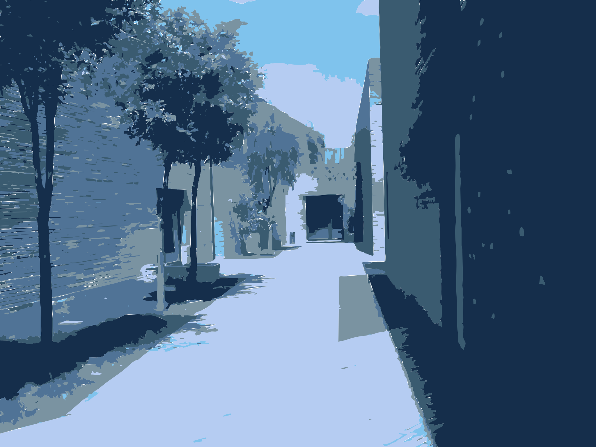 This is a blue and white photo of an alleyway between two buildings. There are several trees lining the sidewalk, providing shade and adding to the overall ambiance of the scene. A person can be seen walking down the alley, possibly enjoying the peaceful atmosphere or going about their daily activities. The combination of the blue and white color scheme, along with the presence of trees, creates a serene and calming environment for those who pass through this picturesque location.