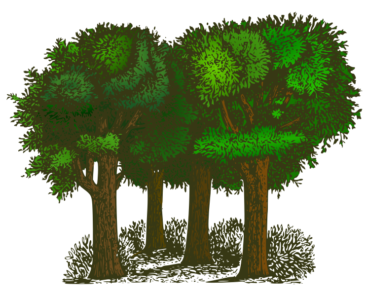 This features a beautifully drawn tree with several branches, creating an impression of a forest. The trees are depicted in various shades of green and brown, giving the scene a natural and vibrant appearance. There is also a bush located near the base of one of the trees, adding to the overall landscape. This artistic representation of nature showcases the intricate details of the tree and its surroundings, making it an appealing visual for viewers.