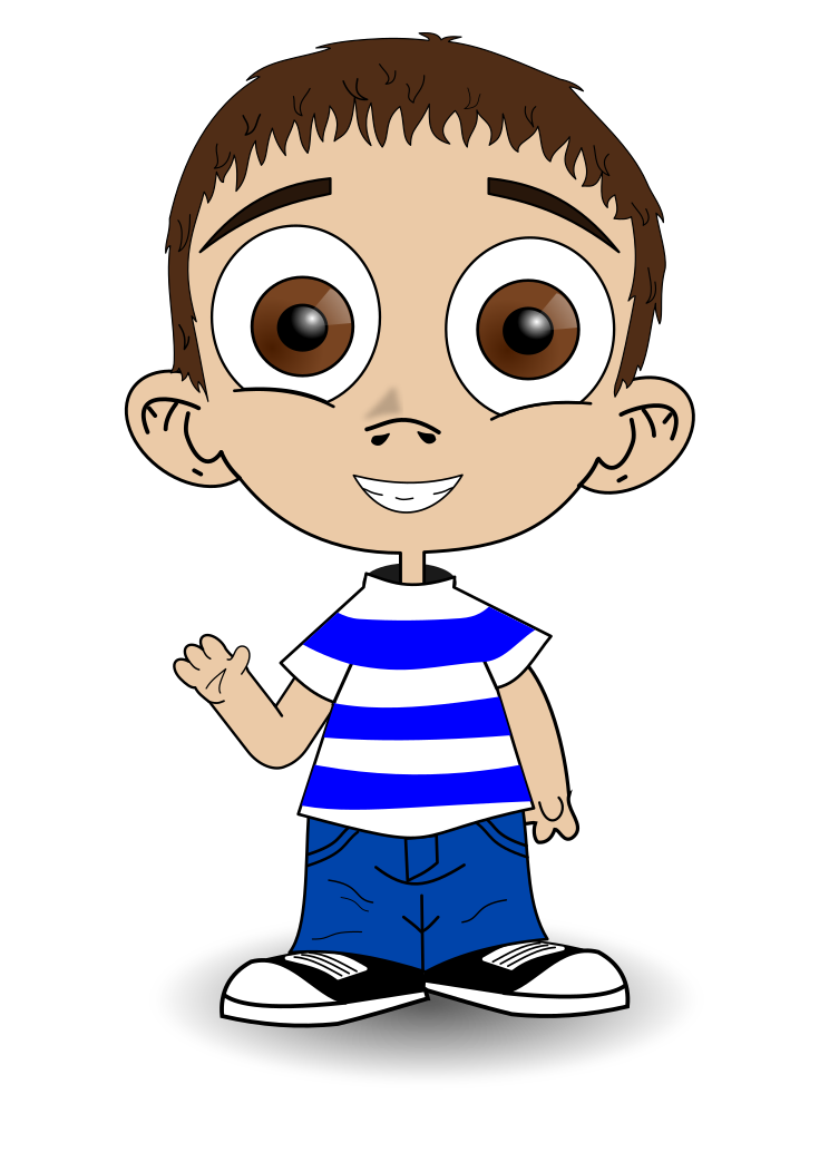 This features a cartoon drawing of a young boy wearing a striped shirt and jeans. He is standing with his hands on his hips, giving off a friendly vibe. His eyes are wide open, and he appears to be smiling at the camera. The overall appearance of the character gives off a fun and playful atmosphere.
