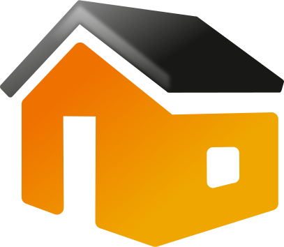 This features a house with an orange roof and black trim. It is depicted as a two-dimensional, flat design, giving it the appearance of a box or a building block. The house has a prominent triangle shape on its roof, adding to its unique architectural style. The overall color scheme of the house consists of orange for the roof and black for the trim, creating an eye-catching contrast against any background.