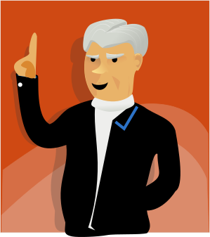 This features a cartoon drawing of an older man wearing a suit and tie, pointing his finger at the viewer. He appears to be making a point or giving instructions. The man's attire suggests that he might be in a professional setting or attending a formal event. The drawing is done with a black outline, which adds depth and contrast to the image. Overall, it presents an engaging visual representation of a person in a business suit pointing at something important.