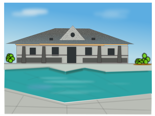 This features a large house with a blue swimming pool in front of it. The house is situated on top of a hill, and the pool appears to be empty at the moment. There are several windows visible on the house, giving it an inviting appearance. Above the house, there is a small roof with a hole in the middle, which adds character to the building's design. Additionally, there are two potted plants located near the house, one closer to the left side and another further back on the right side.