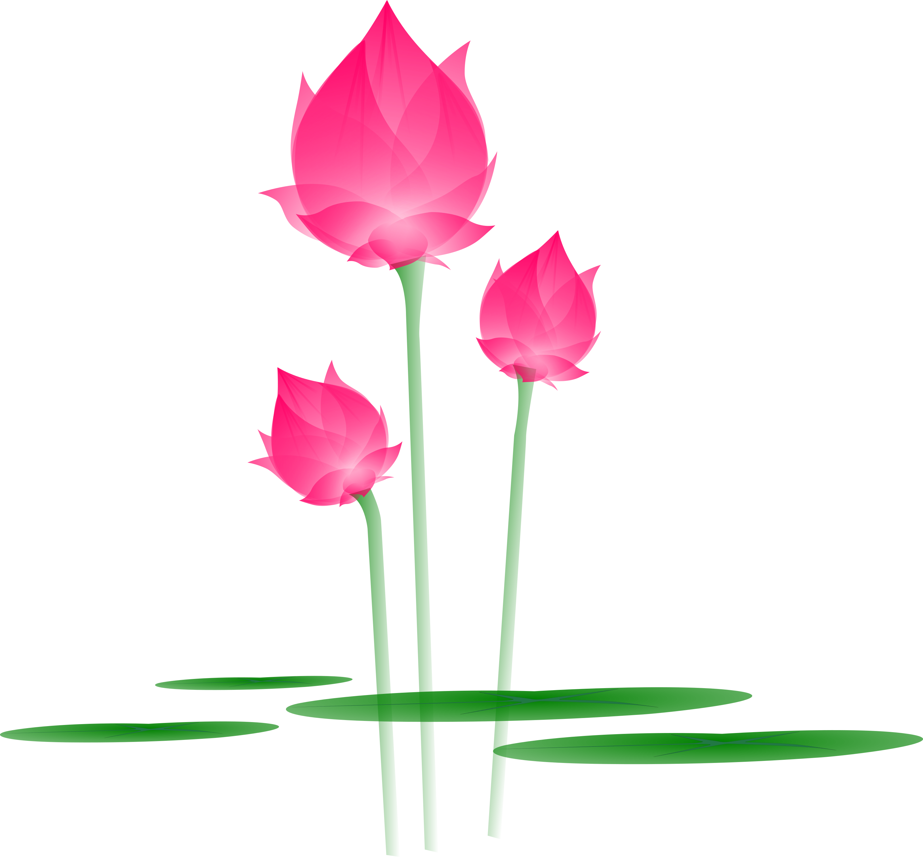 This features three pink flowers with green leaves, standing in a water-like environment. They are positioned close to each other and appear to be growing from the same plant. Each flower has a long stem that extends upwards, creating an elegant and harmonious display. The combination of the vibrant pink petals and the lush green foliage creates a visually appealing scene, reminiscent of a painting or a photograph with a watercolor effect.