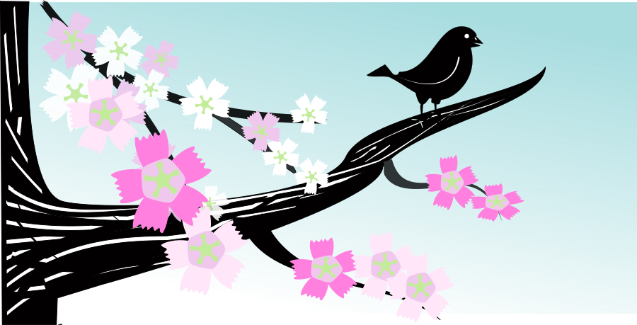 This features a black and white illustration of a branch with pink cherry blossoms blooming on it. A bird is perched at the end of the branch, adding a sense of life to the scene. The overall composition creates an artistic and visually appealing representation of nature's beauty.