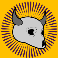 This features a skull with horns, possibly representing the devil or an evil creature. It is placed in the center of a yellow circle that resembles a sunburst pattern. The skull's facial expression appears to be sad and somewhat distressed, giving it a melancholic appearance. This unique design could be used for various purposes such as artwork or symbolism related to spirituality, mythology, or even pop culture.