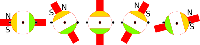 This displays a diagram showing the stages of a commutator turning in a motor. There are four circles on the diagram, each representing different stages of rotation. These stages include the initial stage where the commutator is stationary, followed by the first stage of rotation, then the second stage, and finally the third stage where the commutator completes its full rotation. The diagram provides an illustration of how a motor works with the help of a commutator to transfer energy from one part of the circuit to another.