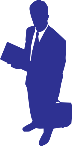 This features a silhouette of a businessman dressed in a suit and tie, holding a briefcase. He appears to be standing against a light brown background, which contrasts with his dark blue outfit. The man's attire suggests that he is likely a professional or corporate individual, possibly on his way to work or an important meeting. The briefcase he carries further emphasizes his role as a businessman, as it is often associated with carrying documents and other essential items for work-related tasks.