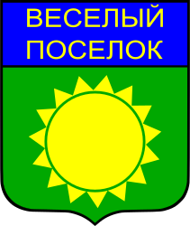 This features a green and yellow coat of arms with the words "Vyesyoly Posyolok" written in Russian. This is likely an informal coat of arms for Vyesyoly Posyolok, which could be a district or village located within St. Petersburg. The coat of arms has a sun symbol in the center, surrounded by green and yellow colors that make up the majority of the design.