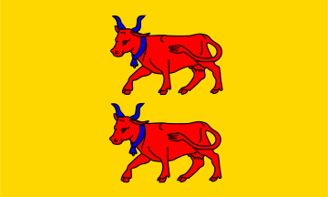 This features a yellow background with two red bulls walking across it. Each of the bulls has blue ribbons tied around their necks, adding a touch of color to the scene. The bulls are positioned in such a way that they appear to be running or galloping across the background, creating an energetic and dynamic atmosphere.