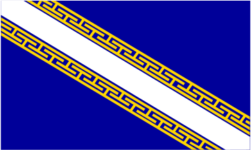 This features a blue and yellow flag with white stripes. The flag is adorned with intricate gold designs, giving it an elegant appearance. The colors of the flag are predominantly blue, with some yellow and white accents. The design on the flag appears to be Greek in nature, adding a touch of sophistication to its overall look.