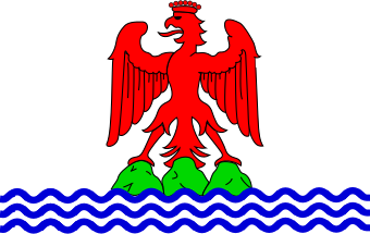 This features a red and blue flag with an eagle on top. The bird is perched atop a rock, giving the impression of being in flight. The eagle's wings are spread out, adding to its dynamic appearance. The flag has a blue background, which contrasts nicely with the bold colors of the eagle. This design creates a striking visual effect that captures attention and showcases the bird as the central focus of the image.