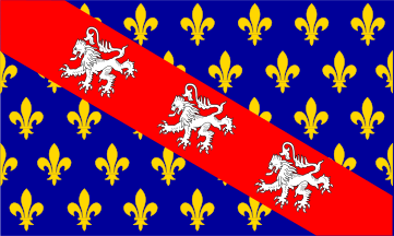This features a blue and red flag with yellow fleurs-de-lis on it. There are several yellow flowers scattered across the flag, creating an eye-catching pattern. The flag is adorned with a lion emblem in the center, adding to its visual appeal. Overall, the flag appears to be well-designed and visually striking.