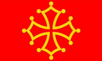 This features a red flag with a yellow cross on it. The cross is made up of small circles, giving the flag an intricate and detailed appearance. The flag has a large size, covering most of the image from left to right. The color scheme of the flag consists of red for the background and yellow for the cross, creating a striking contrast between the two colors.