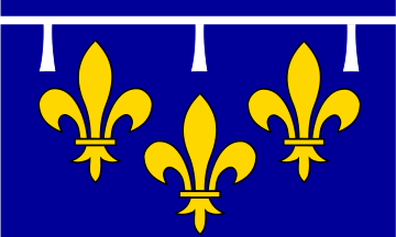 This features a blue flag with three yellow fleur-de-lis, which are decorative flowers. These flowers are arranged in a triangular pattern on the flag, creating an eye-catching design. The flag is likely representing a specific organization or country, as it has a strong visual appeal and symbolizes unity through its use of the fleur-de-lis.