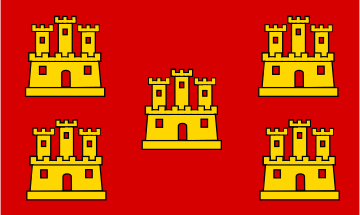 This features a red flag with four yellow castles on it. Each castle is situated at the top of a tall tower, and they are all connected by a bridge. The towers have a distinctive design, giving them an old-fashioned appearance. The flag appears to be a symbol or emblem, possibly representing a city or organization with historical significance.