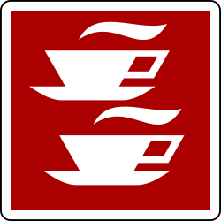 This features a red sign with three white cups on it. Each cup is positioned at the top of the sign, and they are arranged in a row. The cups appear to be stacked or overlapping each other, creating an interesting visual effect. This design could be used for promoting coffee or tea products, as well as conveying a sense of warmth and hospitality associated with cafes.