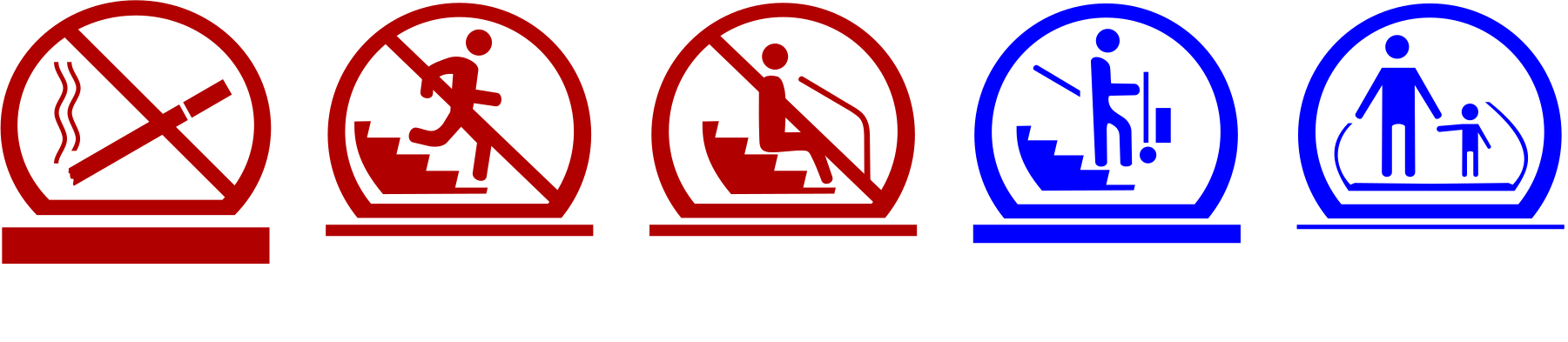This features a collection of five round signs, each with different colors and designs. Three of the signs are red in color, while the other two are blue. These signs appear to be related to transportation or public transit, as they are placed together on the same surface. The variety of colors and designs suggests that these signs may serve various purposes or convey different messages to viewers.