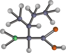 This features a three-dimensional model of a molecule, likely an amino acid. The molecule is composed of multiple atoms, including carbon, oxygen, nitrogen, and hydrogen. These atoms are represented by different colors in the model: carbon is blue-grey, oxygen is red, nitrogen is green, and hydrogen is silver. The molecule appears to be non-polar and hydrophobic, as it does not have any polar bonds or hydrogen bonds. This type of molecular model can be useful for understanding the structure and properties of various chemical compounds.