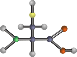This features a three-dimensional model of a molecule, likely an amino acid. It is composed of multiple atoms, including carbon, hydrogen, nitrogen, oxygen, and sulfur, which are represented by different colors. The carbon atoms are blue-grey in color, while the hydrogen atoms are silver. Nitrogen is green, oxygen is red, and sulfur is yellow. This model provides a visual representation of the molecule's structure, allowing for better understanding of its composition and function.