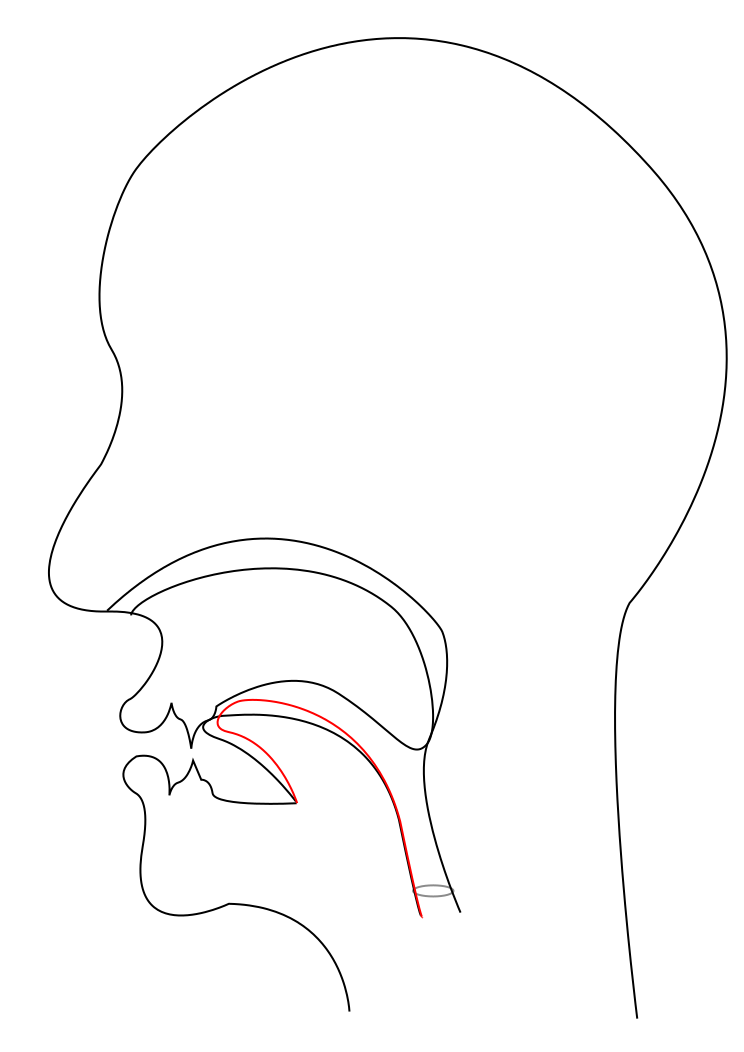 Tags: articulators, cross-section, diagram, linguistics, median plane, midsagittal, phoneme, phonetic, black and white, red line, dark background