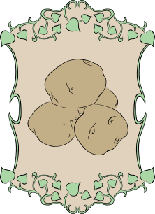 This features a decorative border with three potatoes, or gourds, placed in the center. These potatoes are depicted as if they were painted on paper and have a slightly faded appearance. The border itself is adorned with intricate green leaves that surround the potatoes, adding to the overall visual appeal of the image.