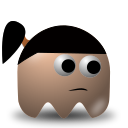 This features a cartoon-like character with a ponytail, wearing glasses and looking somewhat sad. This character is designed to resemble a female Pac-Man ghost. The character's eyes are wide open, giving it an expressive appearance. The overall design of the character appears to be simple yet engaging, making it suitable for various applications such as video games or digital artwork.