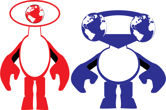 This features two cartoon-like characters, each with a different color. One character is red and the other is blue. They both have large heads that resemble the Earth, giving them an alien appearance. Each of their heads has a small circle in the center, which could be interpreted as a planet or a button. The two characters are standing next to each other, creating a visually interesting scene.