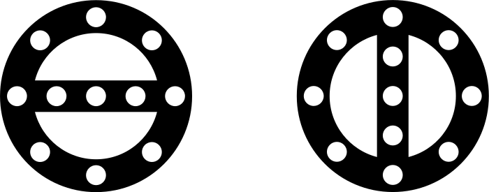This features two black and white circles with a total of 16 dots in each. These circles are placed side by side, creating an interesting visual effect. They appear to be part of a larger design or pattern, possibly related to railways or transportation systems. The arrangement of the circles suggests that they might be used for signaling purposes or as a decorative element within a larger context.