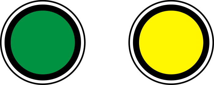 This features two green and yellow traffic lights placed side by side. These traffic lights are positioned in the center of the scene, with one being slightly higher than the other. They appear to be a part of a larger sign or structure, possibly related to railways or transportation systems. The colors of the traffic lights suggest that they may indicate different directions or statuses for vehicles and pedestrians passing through the area.