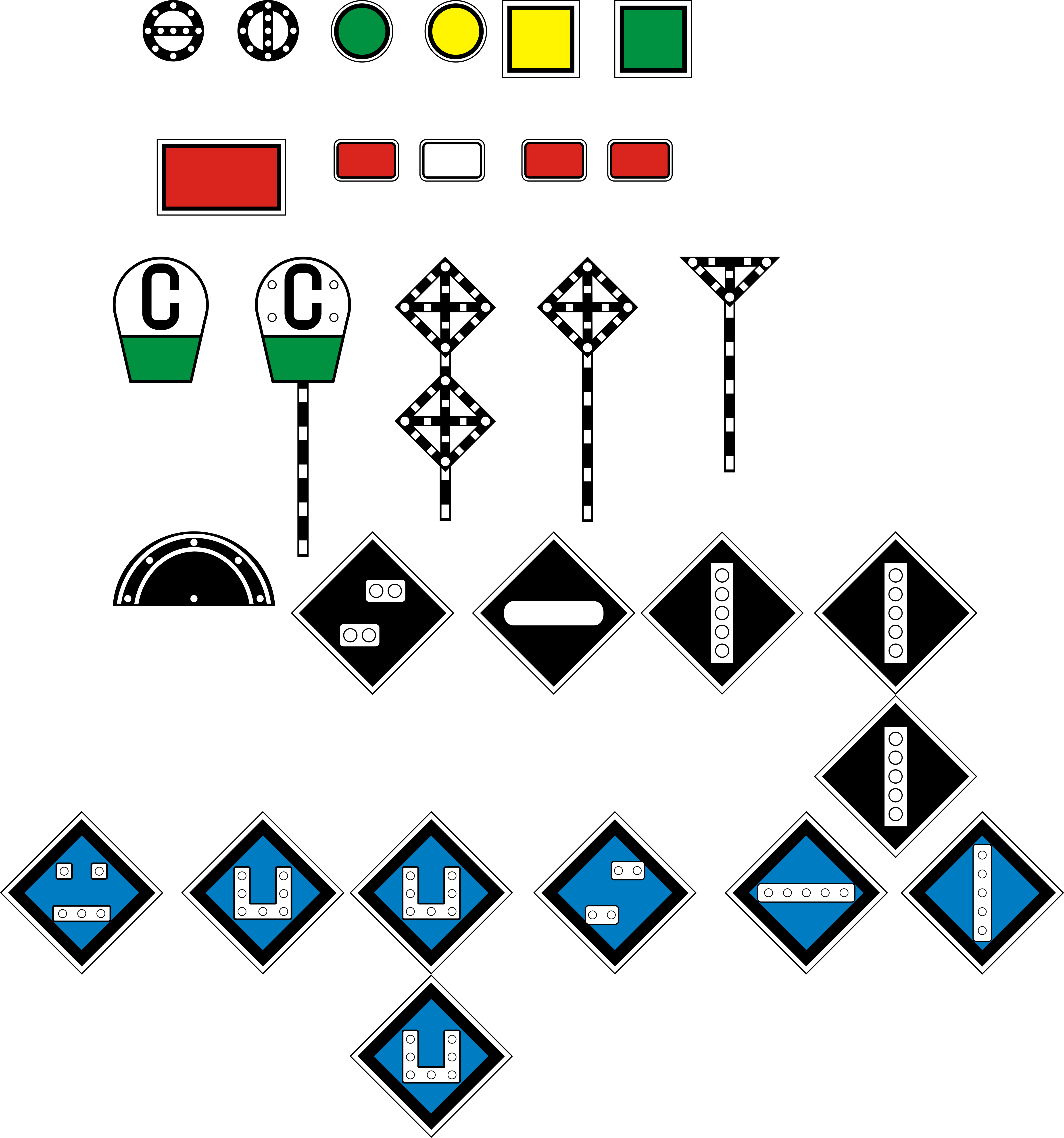 This displays a collection of various symbols and signs, including traffic signs. These symbols are arranged in rows, with each row containing different types of signs. Some of the signs include arrows, circles, and other shapes. There is also a clock present among the symbols, indicating that time might be an important factor for understanding these signs. The collection appears to be organized in such a way that it can be easily understood by viewers, making it a useful reference tool or educational resource.