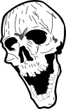 This features a black and white drawing of a skull with its mouth wide open, giving the impression that it is laughing. The skull has teeth visible in its mouth, adding to the realistic appearance of the skeletal structure. The overall design of the skull appears to be somewhat distorted or cracked, which adds an interesting and unique touch to the drawing.