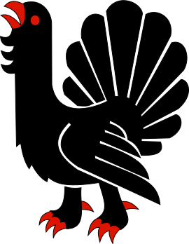 This features a black and red bird with long tail feathers, standing on two legs. It appears to be an emblem or logo, possibly representing a specific organization or event. The bird's color scheme is predominantly black, but it has some red accents that add visual interest to the design. The bird's wings are spread out, giving it a dynamic and powerful appearance. Overall, this image showcases an eye-catching and unique emblem with a strong visual impact.