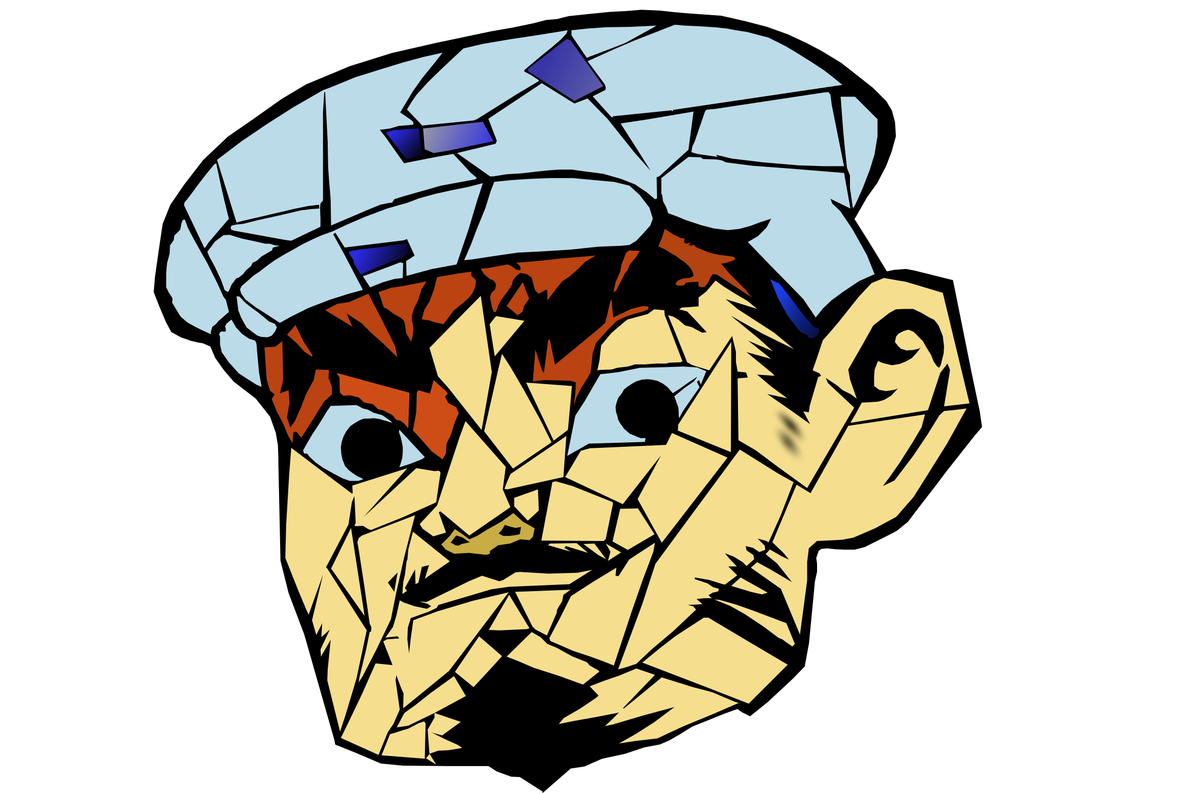 This features a cartoon-like drawing of a man's face, with the eyes and mouth being the most prominent features. The eyes are large and round, while the mouth is open in an exaggerated manner. The facial expression appears to be angry or displeased. The overall style of the drawing gives it a comic book-like appearance.