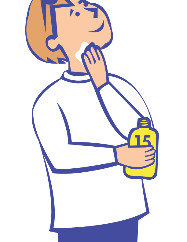 This features a cartoon-like person with blonde hair, wearing a white shirt and holding a bottle of sunscreen. They are in the process of applying the lotion to their face, possibly using an electric razor for shaving. The scene is set against a light brown background that adds depth to the image. This illustration could be part of a brochure or advertisement promoting sun protection and skin care.