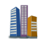 This features a cityscape with three tall buildings, each with different colors. The first building is blue and white, the second one is orange and yellow, and the third one is purple. These skyscrapers are located in an urban environment, possibly near a beach or waterfront area. The buildings appear to be well-maintained and contribute to the city's skyline.