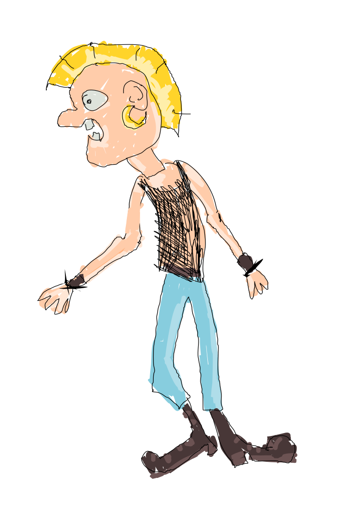 This features a cartoon drawing of a man with spiky hair, wearing tight jeans and a black shirt. He has a bandanna around his neck and is holding a guitar in one hand. The character appears to be a punk rocker, possibly drawn using brush strokes for added detail. The image also includes a clock on the wall behind the man, adding an element of time awareness to the scene.