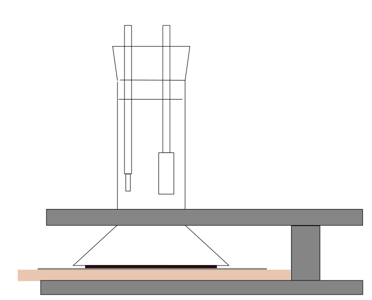 This features a large, gray metal structure with a wooden table on top of it. This structure appears to be an industrial or scientific device, possibly used for testing purposes. A chair is situated near the top of the structure, providing seating for someone who may operate the device. Additionally, there are two small figures in the scene, one located towards the left side and another closer to the center. These figures might represent people working with the equipment or observing its operation.