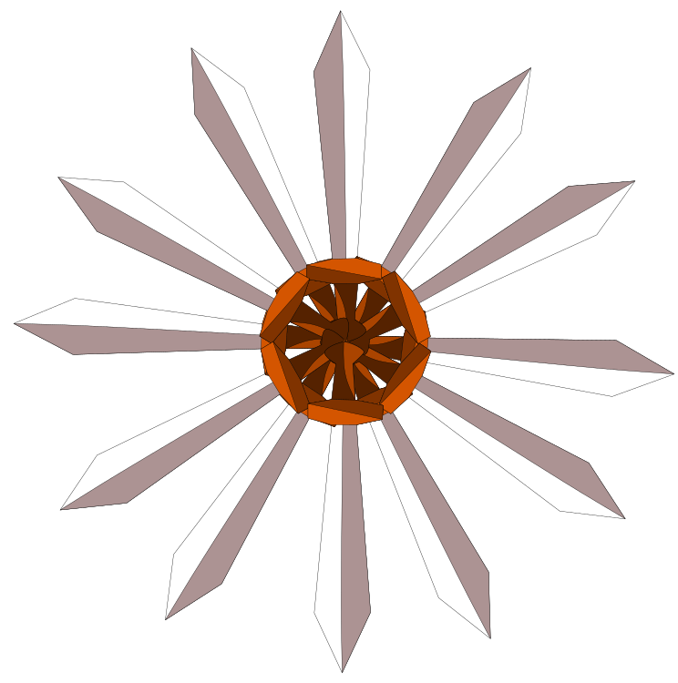 This features a large, intricate design of a flower made up of multiple triangular shapes. These triangles are arranged in such a way that they create the illusion of a single, unified flower shape. The flower is composed of various shades and colors, giving it an interesting and visually appealing appearance. The overall effect is one of complexity and beauty, making this design stand out as unique and eye-catching.