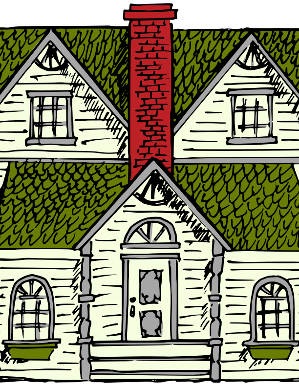 This features a large, old house with green and red colors. It has four windows on the front of the building, as well as a door that is situated in the middle. Above the door, there is a red chimney that adds to the overall charm of the house. The house appears to be an older structure, possibly made of wood or brick, with a classic design.