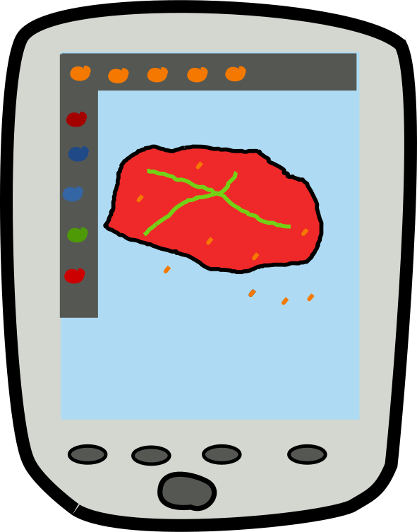 This features a cell phone screen displaying an artistic drawing of a piece of meat. The drawing is in red and green colors, giving it a unique appearance. The cell phone itself occupies the majority of the frame, with the drawing taking up most of the screen space. This creative representation of food on a cell phone could be used as a wallpaper or simply for personal enjoyment.
